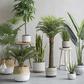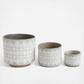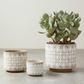 The stoneware planters with white patterns are a set of three elegant and chic accessories for indoor plants. They have a smooth and matte finish, with a white geometric pattern that adds contrast and interest to the planters. The pattern is inspired by the shapes and forms of nature, creating a harmonious and organic look. The planters are made of high-quality stoneware that is durable, sturdy, and easy to clean. The planters have a round shape and a flat base that allows them to stand firmly on any surface. The planters come in three different sizes: large, medium, and small. 10 inches in diameter and 10 inches in height (large), 7.5 inches in diameter and 6.25 inches in height (medium), and 5 inches in diameter and 4.25 inches in height (small). They can hold 8-inch, 6-inch, and 4-inch pots respectively. These planters can be used to display favorite plants, such as ferns, succulents, or orchids, in a living room, bedroom, or office. They will add a touch of style and modernity to contemporary, minimalist, or Scandinavian-style home decor.