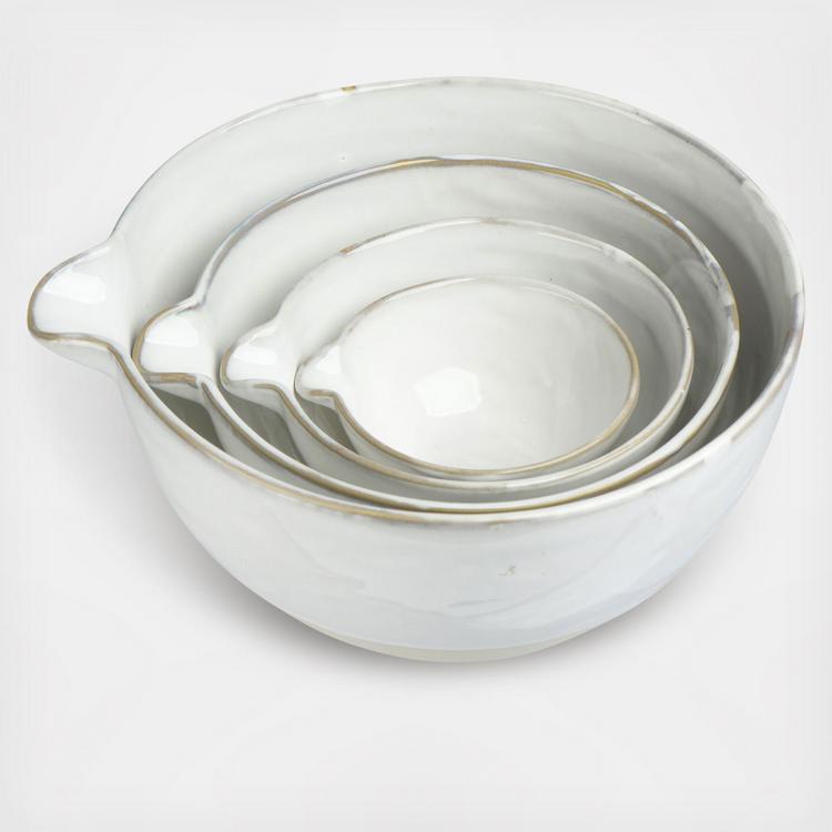 These batter bowls are a beautiful addition to any kitchen. These are perfect for mixing any ingredients and still having your kitchen look classy. With the colors being white and beige, these neutral bowls will fit in with any other kitchen supplies. They are uniquely made with reactive glaze, so each one will be different.