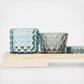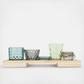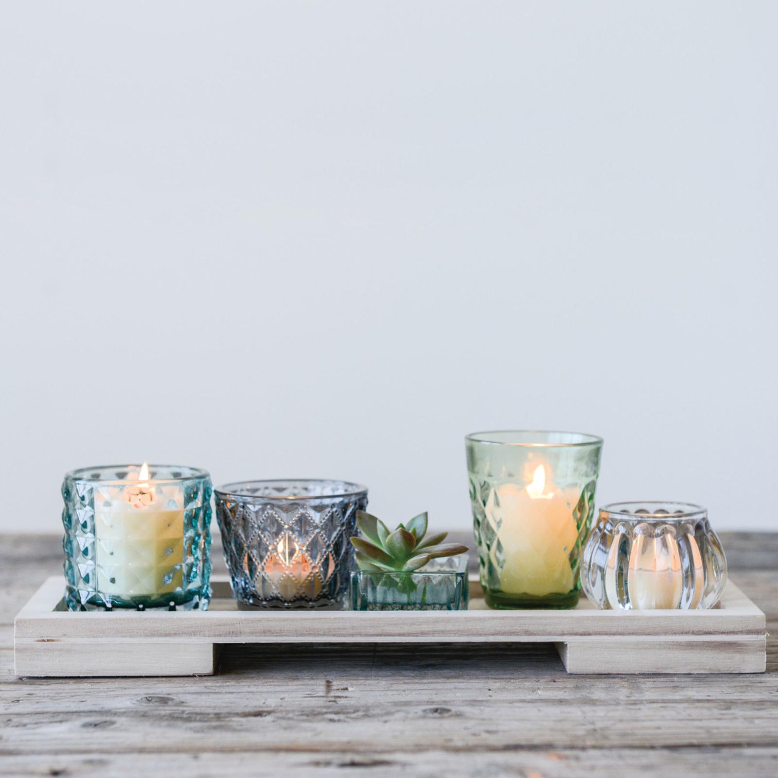 Illuminate the home with this set of 6 embossed glass votive tealight holders with a wood tray. This set features six glass holders that have an embossed texture and different colors, creating a unique and vibrant look. The glass holders can hold one votive or tealight candle each (not included), which creates a cozy and romantic atmosphere. The wood tray is made of solid wood that has a natural texture and color. The wood tray is easy to carry and display and adds a touch of rustic and cozy style to any space. Whether used as standalone pieces or with a matching set, these votive tealight holders will be stunning accents for mantelpieces, dining tables, or console tables.