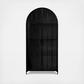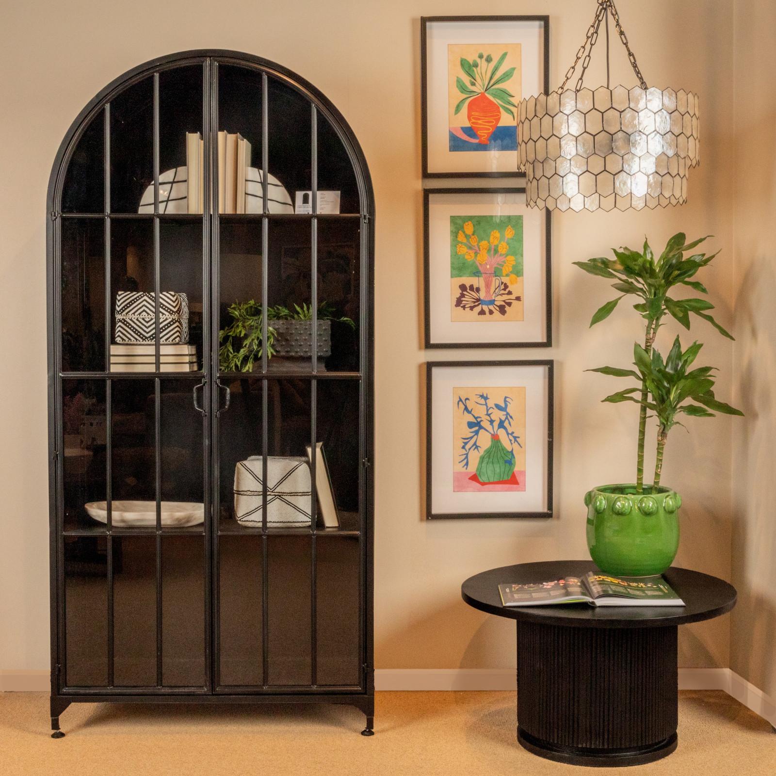 Enhance the home with this stunning and functional black metal and glass cabinet. Featuring two glass doors with arched frames, it opens to reveal three spacious shelves for storing and displaying favorite items, which hold up to 130 pounds. The glass doors add a touch of lightness and elegance, while the black metal frame provides a striking contrast. With its simple and elegant design, this cabinet complements any style of decor. Whether in the living room, dining room, or office, this black metal and glass cabinet will impress with its style and functionality.