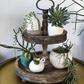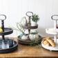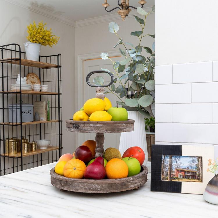 This 2-tier tray is a perfect addition to your home décor. Place it in the kitchen full of spices or mugs. In the family room, place it next to the couch and use it to store remotes. The best idea might be to place it on a shelf with a combination of knick knacks and greenery spread throughout.