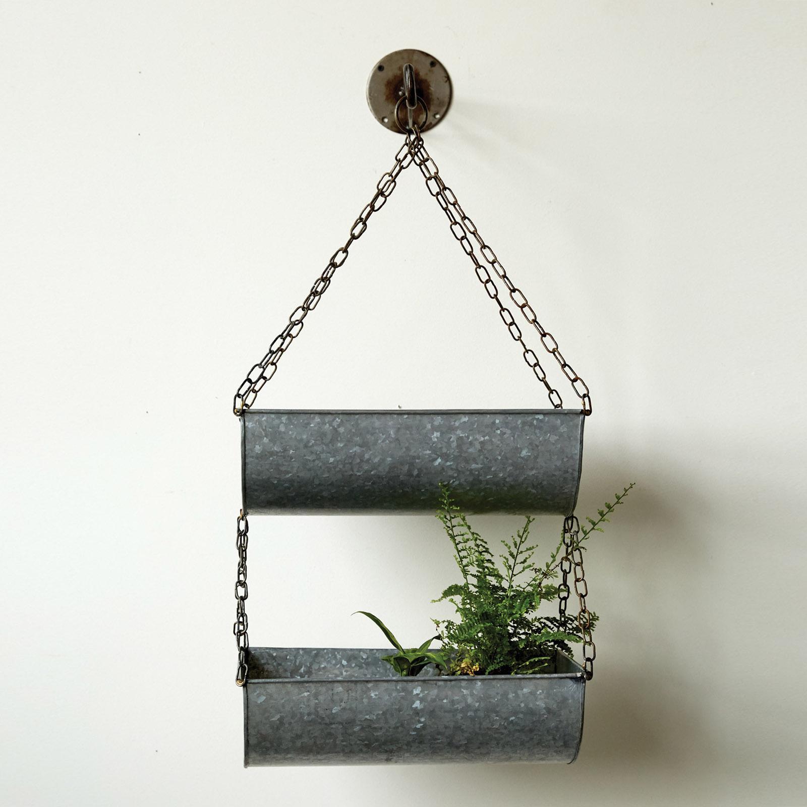These two 2-tier hanging metal baskets on the chain make the most of the vertical space. These baskets feature a metal construction with a grey finish that creates a rustic and antique look. The baskets have two tiers, each holding various items such as fruits, vegetables, herbs, flowers, or accessories. The baskets hang from a metal chain, making them easy to suspend from the ceiling, wall, or hook.Use them in the kitchen, living room, bathroom, or bedroom. Whether for organizing items or adding some flair to the home decor, this set of two 2-tier hanging metal baskets on a chain is a great choice.