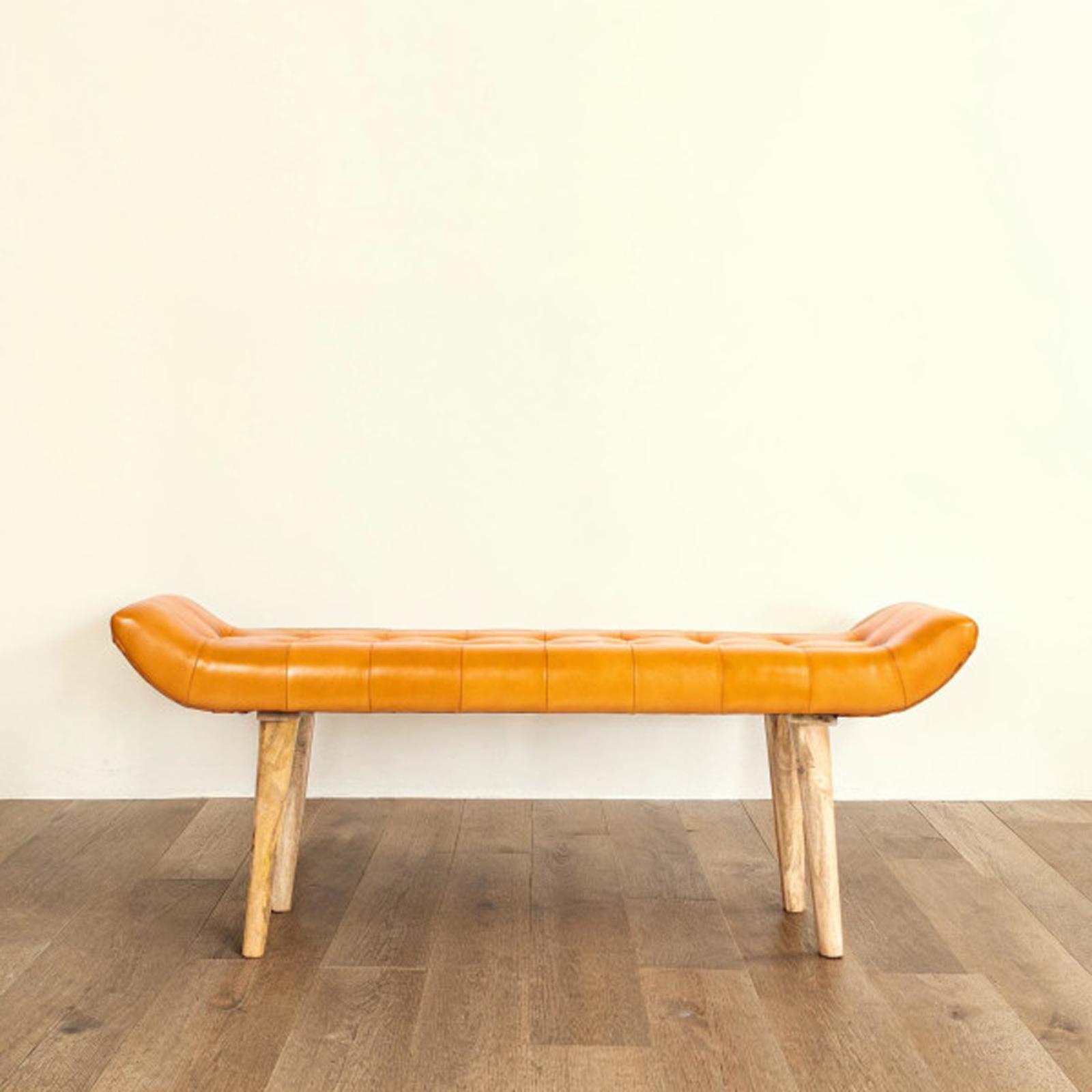 The fabric ottoman bench is wrapped in a high quality goat leather while the base is constructed from mango wood. The neutral brown leather allows this bench to blend nicely with most any decor. The bench a great accessory in hallway, bedroom, entrance, bedroom, or living room. This versatile bench can be anything you need it to be: equally suited to serve as a spare seating, a place to rest your feet, or a spot to place decorative pillows at bedtime.