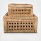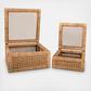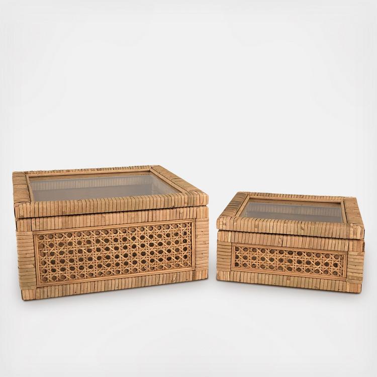 This woven rattan and wood display box with a glass lid set is a beautiful set that will enhance any living space. The set includes two display boxes of different sizes with a square shape and a natural finish. The display boxes are made of rattan and wood, creating a durable and natural combination of materials. The rattan is a natural and sustainable material with a woven texture and a natural color. The wood is a solid and sturdy material that has a smooth texture and a natural color. The display boxes also have glass lids that allow easy viewing of the items inside. The glass lids are hinged, which means they can be easily opened and closed. Use them to store or display photos, jewelry, or other keepsake items in the living room, bedroom, or entryway. The display boxes measure 12 inches x 12 inches x 6 inches for the large box and 9 inches x 9 inches x 4.5 inches for the small box, making them a perfect set for any room. This box set is a wonderful way to curate a space that reflects a unique sense of style with intentionally designed home decor.