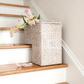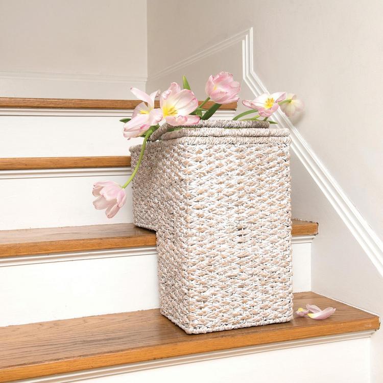 This braided bankuan and rattan stair basket with a whitewash finish and handles is a beautiful and practical piece to enhance home decor. The basket has a unique shape that fits snugly on a staircase, making it perfect for storing or transporting heavily used items, such as books, magazines, toys, or blankets, or for collecting odds and ends that need to be moved to another floor. The basket is made of high-quality bankuan rope, rattan, and wire, natural and eco-friendly materials with a smooth texture and sturdy structure. The basket also has a whitewash finish, giving it a charming and elegant look. The basket has two handles that make it easy to carry and move around. This braided bankuan and rattan stair basket with a whitewash finish and handles is a perfect way to add style and functionality to any home decor.