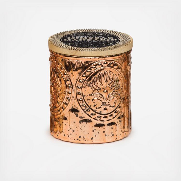 Mimosa and mandarin is a bubbly citrus fragrance featuring top notes of mandarin orange and champagne blended with mimosa blossoms, a touch of coconut and a warm amber base. This gorgeous candle is crafted in an antiqued rose gold mercury glass glaze which creates a glamorous glow when lit.