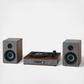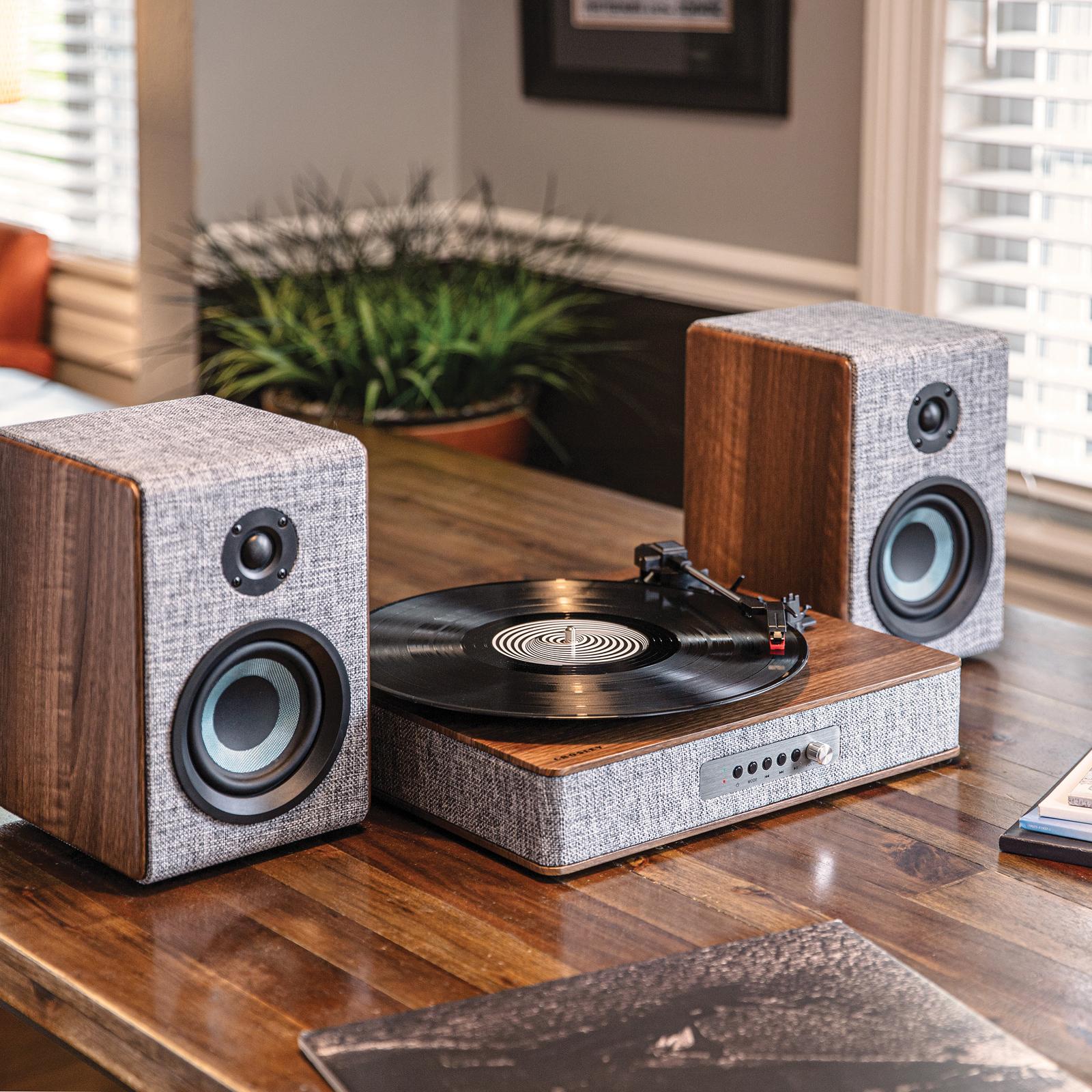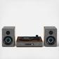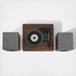 They say clothes make the [wo]man, but in this case, they also make the stereo. Outfitted in eye-catching heather grey fabric accented with walnut wood and silver accents, the Aria Shelf System is definitely dressed for success. The Aria is more than just a pretty face, though: the three-speed turntable boasts a built-in Bluetooth receiver, FM radio, and aux input, and the speakers deliver 2x25 watts of sound. Stunning looks and personality to match? We’re absolutely swiping right on the Aria Shelf System.