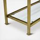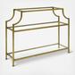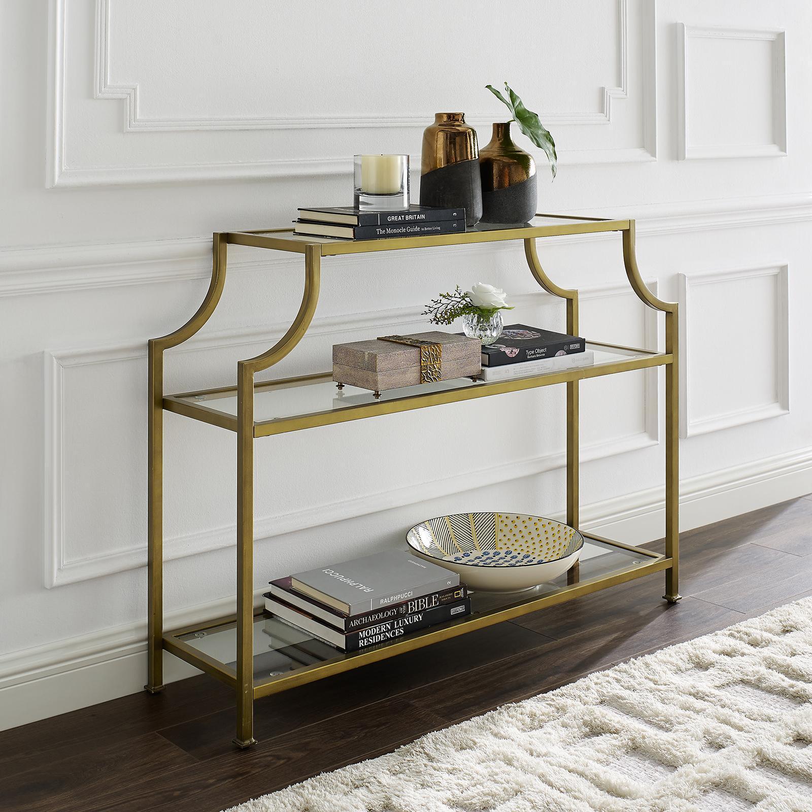 Showcase refined mid-century design, with the eye-catching Aimee console table. This table features an openwork steel frame, warmed with a power-coated polish gold finish and a touch of antiquing. Use the open tempered glass shelves to display memories and trinkets, or intriguing curios from your travels. This console table is stylish enough to stand on its own, or it can be easily paired with the rest of the Aimee Collection.