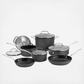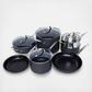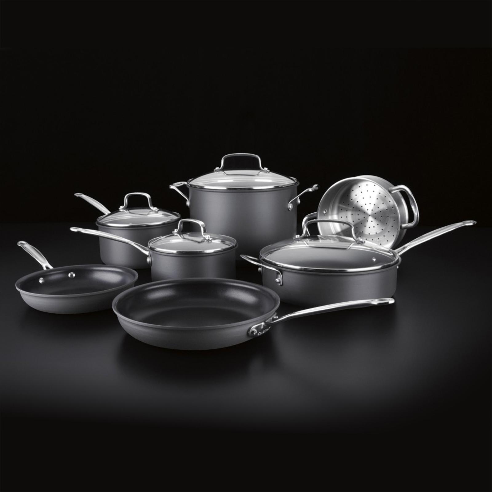 French kitchens were the design inspiration behind this exceptional cookware collection; from reheating a single portion of soup to preparing appetizers, entrees, and side dishes for the entire family, you'll find every tool you need for a lifetime of cooking in this deluxe set. This practical collection includes a nonstick cooking surface, aluminum cores that spread heat quickly and evenly, and tempered glass lids that allow you to check on food without disturbing the cooking process.