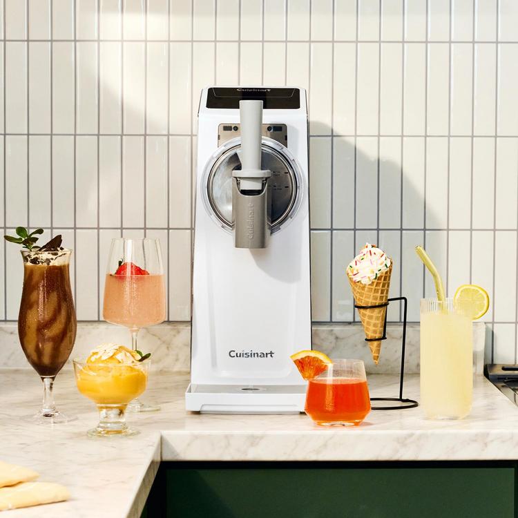 You can create a sweet array of frozen treats in as little as 15 minutes at the touch of a button. The multifaceted Cuisinart 6-in-1 Slushy & Soft-Serve Maker lets you effortlessly create soft-serve ice cream, sorbet, slushies, frappés, and frozen cocktails. This Slushy & Soft-Serve Maker features quick-freeze chill technology to keep treats cold, along with an ultra-quiet motor for low-noise operation. Smart Dispense Control allows for no-mess pours and smooth dispensing. Limited 3 year warranty