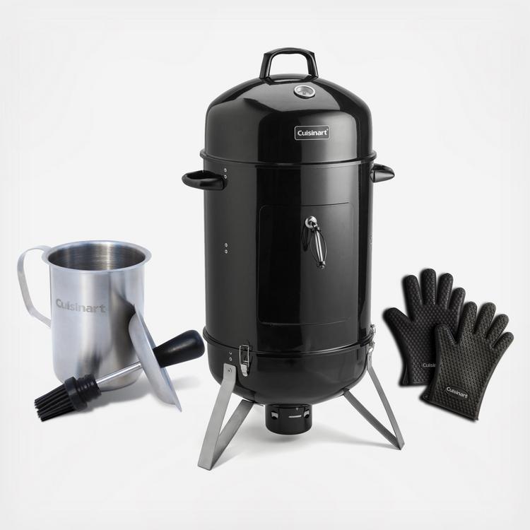 Now you can smoke all of your favorite foods, including cheese, vegetables and meats with the vertical 16-inch charcoal smoker. With two round 16-inch cooking grates that can be stacked inside the smoking chamber, this smoker can accommodate just about any food you want to smoke. Working it is as simple as lighting the charcoal, filling up the water bowl, and then adjusting the air vents to control the amount of heat and smoke leaving the chamber. The vertical barrel design makes it easy to keep a consistent temperature with minimal adjustments. Lift the lid for easy access to foods as they smoke. Cuisinart's vertical smoker is simple to maintain and clean-up is easy. No need to worry about burnt hands again with Cuisinart's heat-resistant silicone gloves are perfect for working with a grill or smoker. Since the gloves are heat resistant up to 425⁰f, you won't have any issue making adjustments to air vents, cooking racks, or removing anything from a hot surface. The Cuisinart Sauce Pot and Basting Brush Set makes it easy to serve up delicious barbecued meat, poultry and seafood every time you grill. This heavy-duty stainless steel pot comes with a secure lid with an integrated basting brush and holds an ample amount of sauce to cover all the food on your grill.