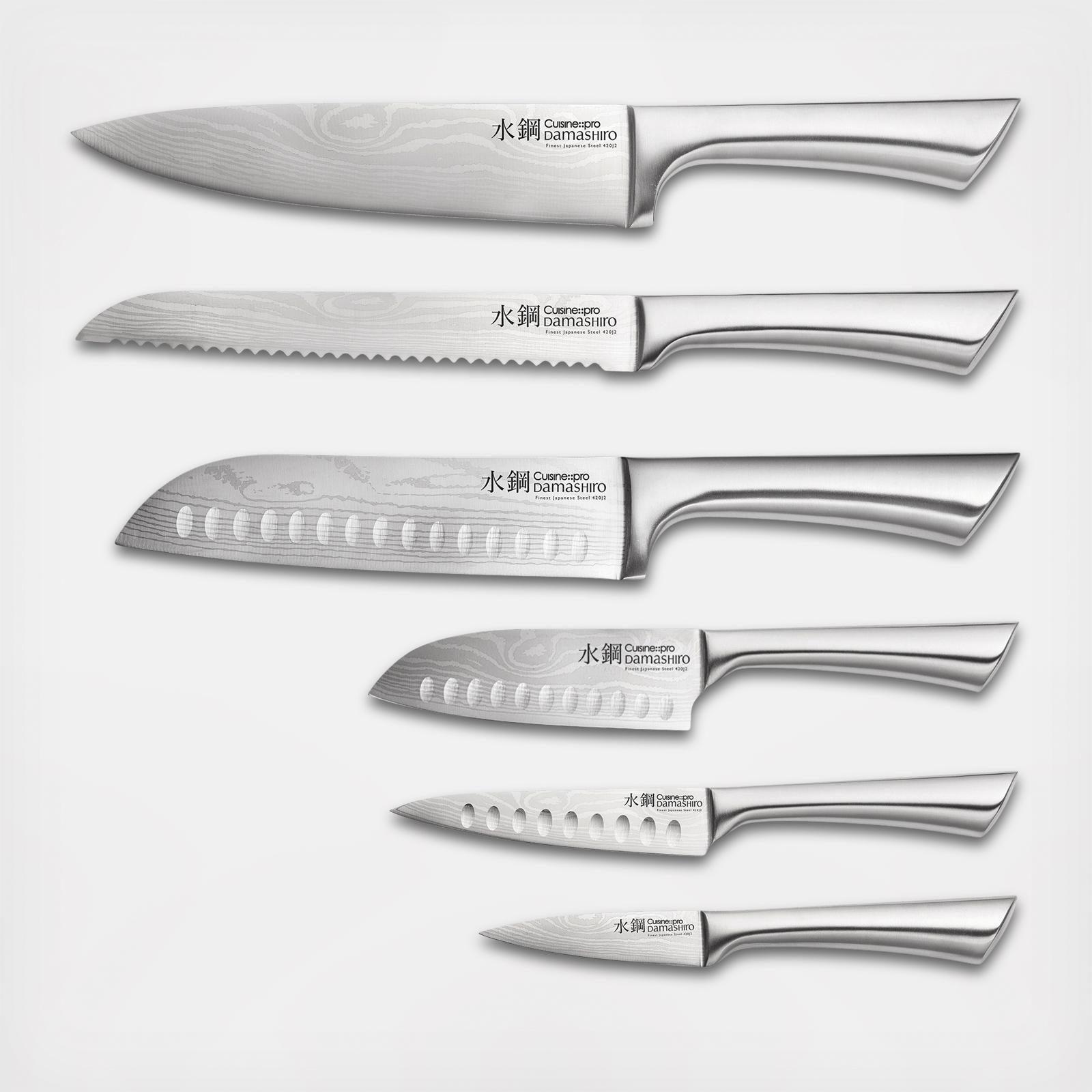 Slice and dice with ease using the Damashiro® 7-Piece Knife Block Set. Damashiro® Japanese knives are made from the finest quality Japanese material. Inspired by traditional Japanese craftsman and Samurai sword makers, these knives are characterized by distinctive traditional inspired Damascus on the blade of banding and mottling reminiscent of flowing water. Damashiro® blades are made from specialist ice hardened Japanese material which makes them super tough, resistant to shattering and capable of being hones to a sharp resilient edge. The block set features 6 essential blades and a stylish knife block to showcase your blades.