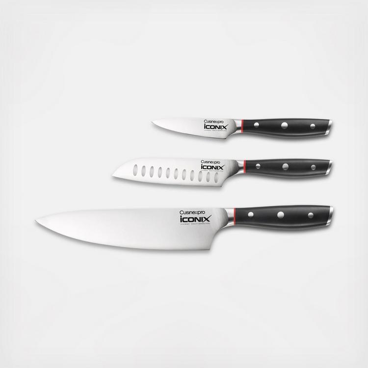 The iconiX™ 3-Piece Starter Knife Set introduces bladesmith perfection to your kitchen. This set offers everything you need to achieve your everyday kitchen cutting tasks. Inspired by the traditional German craftsman and bladesmiths, the iconiX™ blades are made from superior quality German material. With a tapered ground blade, these knives are engineered to withstand more cutting and slicing through a variety of foods. The blades have been ice hardened to ensure the sharpness of the blade and then tempered to enhance their strength. Enjoy perfect balance and control while slicing and dicing with the iconiX™ 3 Piece Starter Knife Set.