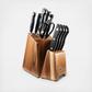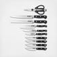 Introduce professional style and quality to your kitchen with the Wolfgang Starke™ Kutchin 11-Piece Knife Block. The Wolfgang Starke™ knives are designed to bring precision and bladesmith perfection to your everyday meal preparation. The blades are produced with a controlled tempered process to ensure the best possible hardness, toughness and flexibility. Forged from superior quality German material, the Wolfgang Starke™ knives are rockwell hardness tested to guarantee the highest level of hardness and tensile strength. Perfectly weighted and balanced for comfort and control, these knives help to avoid fatigue hen slicing and dicing. Designed with professional polymer handles, the Wolfgang Starke™ Kutchin knives assist to hold the hand safely away from the blade for a controlled cutting experience. This comprehensive set comprises of four steak knives, a paring knife, utility knife, santoku knife, bread knife, chef and kitchen shears.