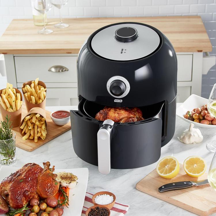 Cook delicious, healthier fried food for the whole family. Technology circulates hot air to cook thoroughly without the oil and mess of a standard fryer, reducing added fat while maintaining flavor and crispiness. The two adjustable dials allow you to control time and temperature, so simply plug in the fryer, enter your settings, and you are ready to go. The air fryer cooks large servings of fries, veggies, wings, and more: even a whole chicken.
