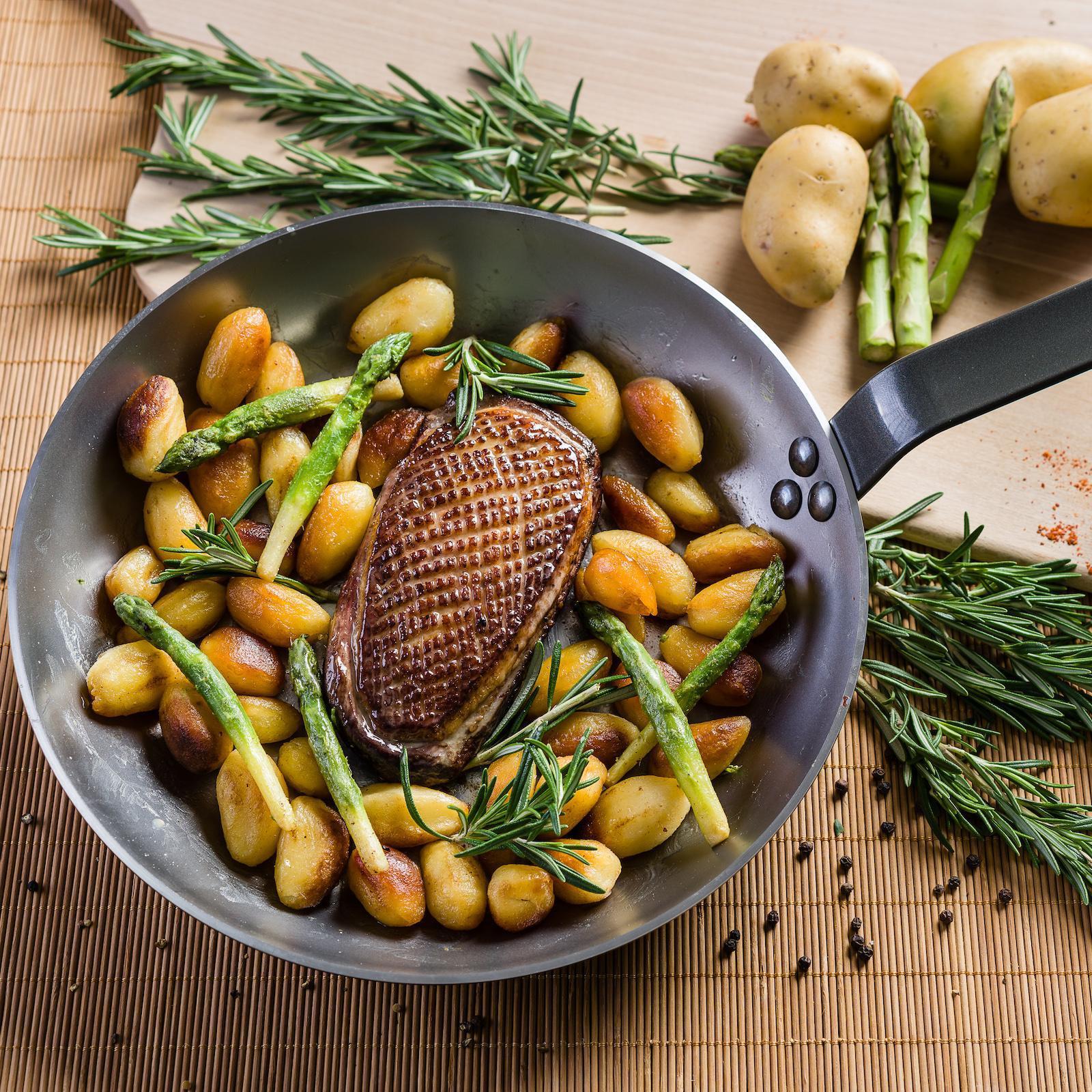 Our Mineral B Carbon Steel Fry Pans excel in frying, grilling, and searing, making them ideal for achieving the Maillard reaction, where the caramelization of natural sugars in food helps to seal in flavor and moisture. Composed of 99% iron and 1% carbon, these pans are robust and durable. With no artificial coatings, they develop a natural nonstick surface as they become seasoned over time; the darker they become, the better the nonstick.