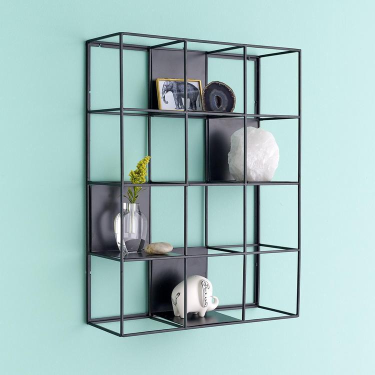 This geometric sculpture may look simple, but its applications are endless. Mount on your wall or place on a console table or bookshelf to contain and display treasures and objects of interest. Discreet notches on the back allow for hanging vertically or horizontally. Four shadowbox-like shelf inserts are included and can be arranged anywhere in the grid to customize your display.