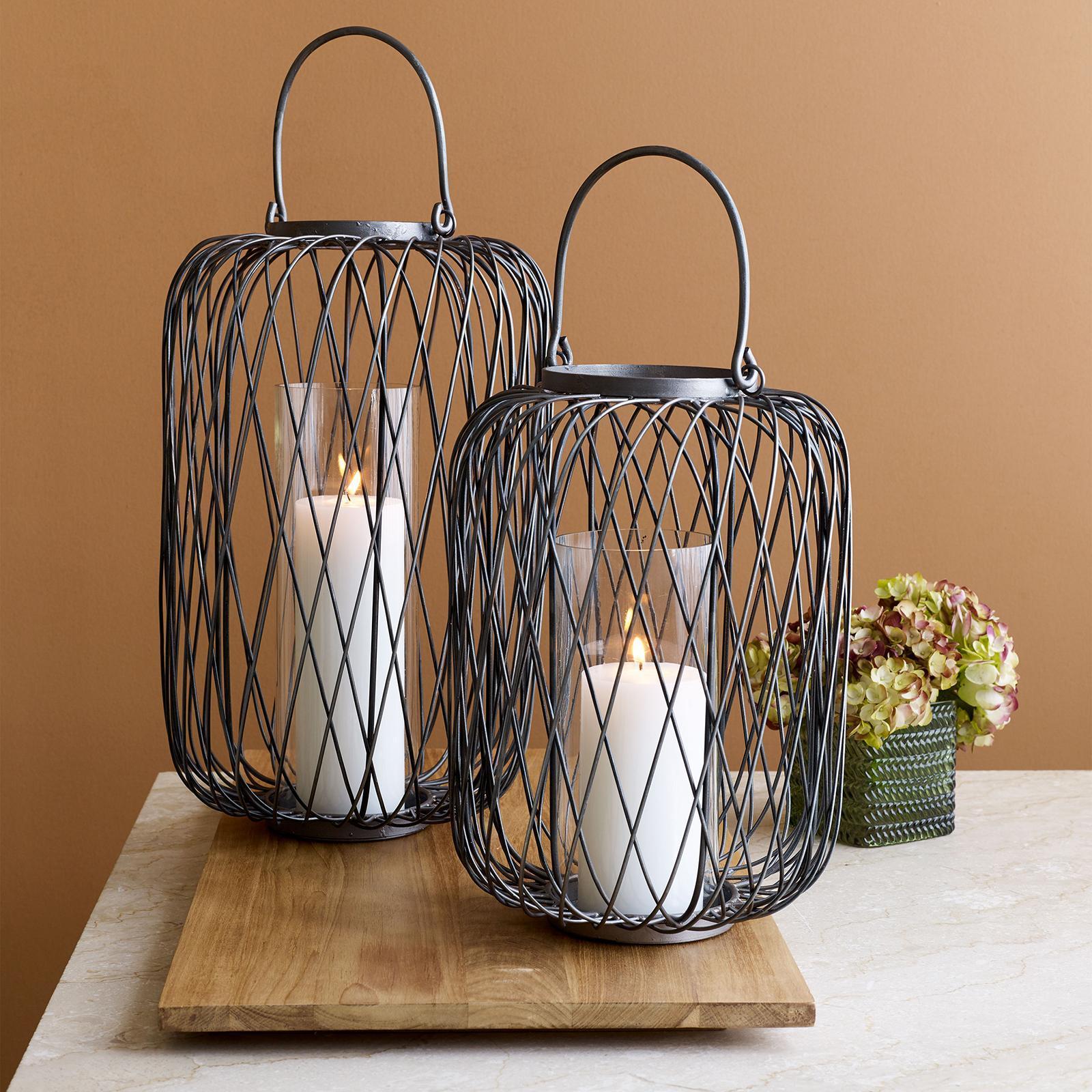 Cast a warm glow on your patio or in your home with our industrial Spokane lanterns. The cross-crossed patterned steel encases a glass hurricane to protect a pillar candle (not included). Pair both sizes together for a dramatic effect on your patio.