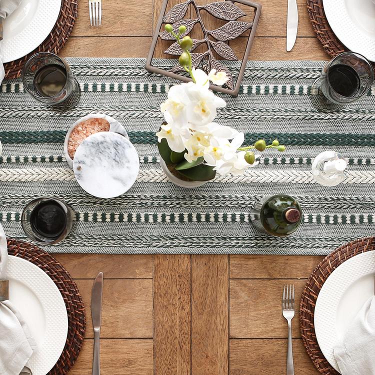 These Braided Cotton Table Runners are a great way to style your table for dinner parties, weddings, or other elegant events on a budget. The modern, chic look is sure to catch the eyes of your guests. Adds bohemian flair and dimension to the table. They are also great for entry way tables, coffee tables, dining tables, or other surfaces of your home. Offers delightful home products including matching cloth napkins, napkin rings, placemats and tablecloths.