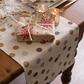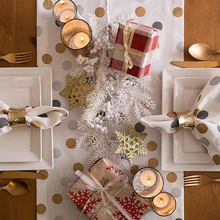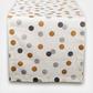 This Metallic Printed Table Runner is 100% cotton with a whimsical holiday design to add flair to your table. Metallic gold and/or sliver printed holiday icons on a white background is an chic and contemporary way to add Christmas cheer to your home. The Size is long enough for most surfaces. Great for entry way tables, low book shelves, dining tables, or other surfaces of your home as well.