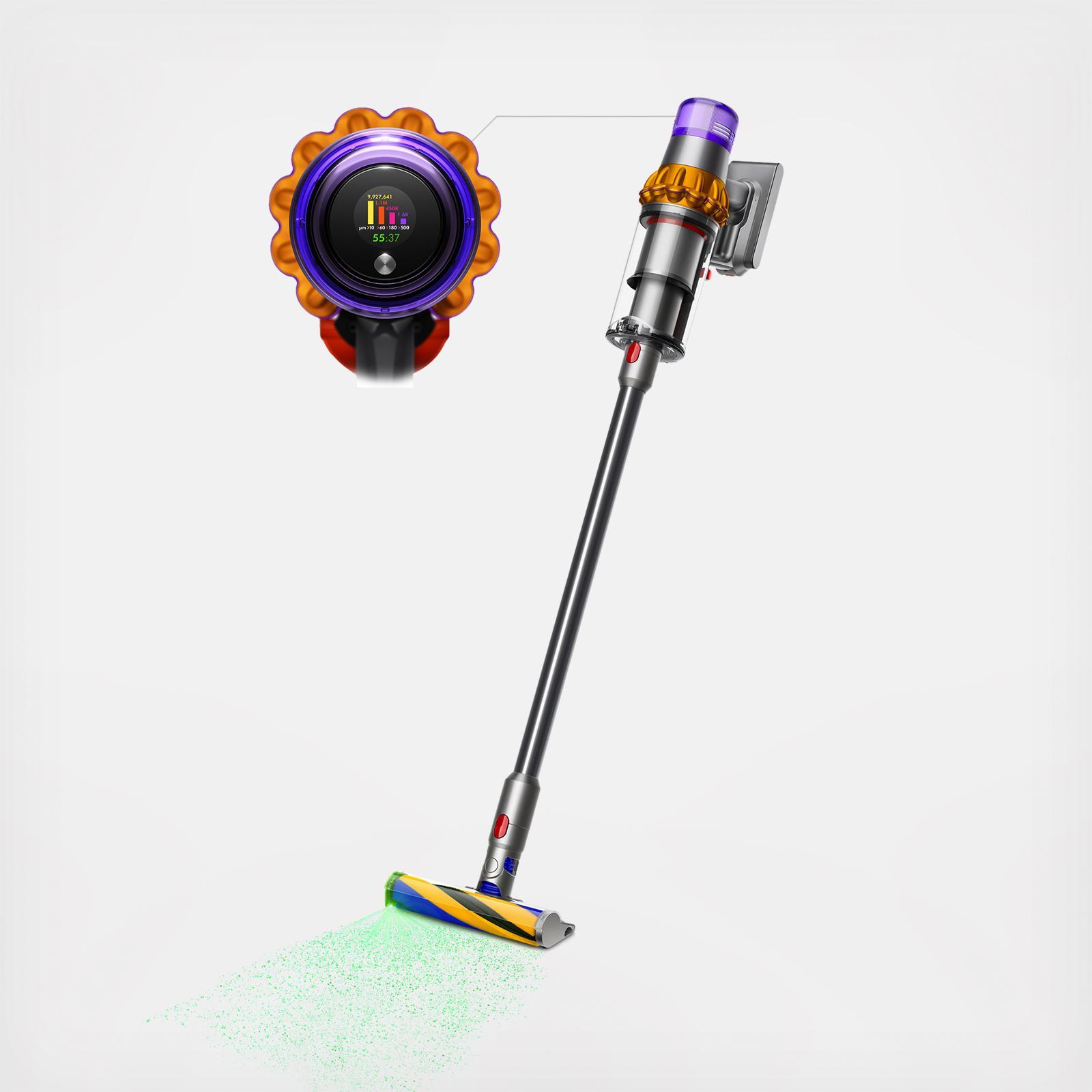 The V15 Detect Cordless Vacuum features a Laser Slim Fluffy cleaner head laser that detects particles and a Detangling Motorbar cleaner that clears hair from the brush bar. Hair screw tools pick up both pet hair and long hair while sensors size and count dust particles to adjust power. The V15 includes three cleaning modes, Eco Auto Boost, and Root Cyclone Technology with a battery that provides up to 60 minutes of use.