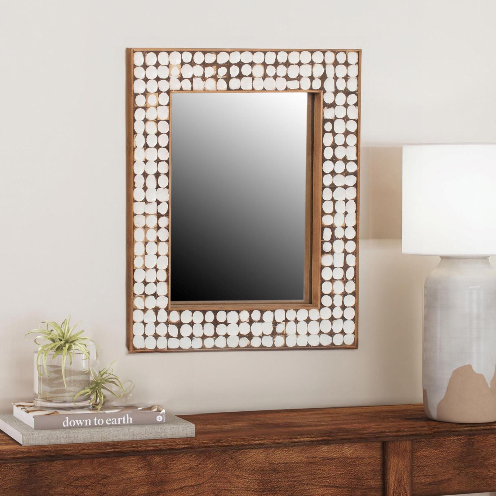 Crafted from individually hand-laid pieces of recycled coconut shell, this rectangular mirror introduces a natural, organic texture to your decor. Each piece is uniquely finished with a soft white patina, highlighting the beauty of natural variation and the handcrafted quality of the design. With versatile mounting options, this mirror can be displayed horizontally or vertically and includes D-rings for easy installation. Perfect above a dressing table or as a stunning entryway accent, it’s an elegant way to bring artisinal, eco-friendly style to your space.