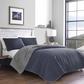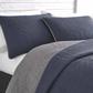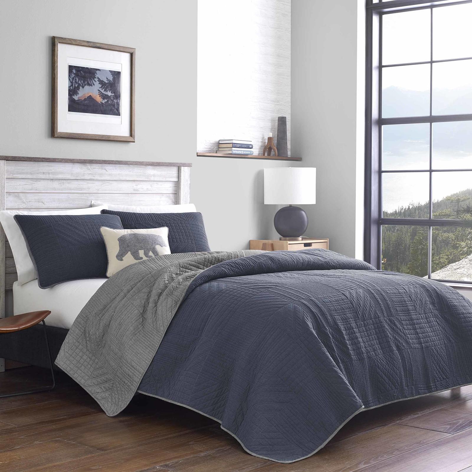 Casual comfort meets modern style in this soft, prewashed cotton blend quilt set featuring a washed denim blue yarn dye face reversing to solid chrome gray. Hidden lake quilt set is as stylish and comfortable as your favorite denim jacket, but the subtle geometric patterning in the block quilt stitching gives it a modern edge. Keep it crisp and modern with solid color sheets, or layer in some signature Eddie Bauer decorative touches with novelty flannel sheets, a bear appliqued pillow, and a cozy faux fur accent pillow to complete the look.