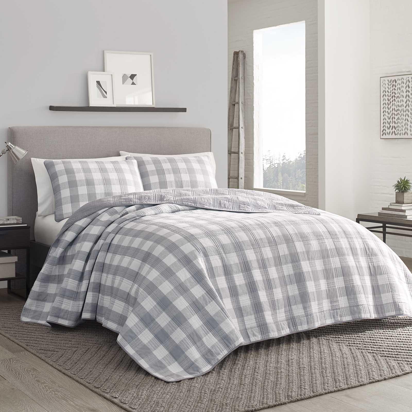 Update your bedding ensemble with the lake house plaid cotton grey quilt set from Eddie Bauer. Featuring an updated take on a classic plaid pattern, this grey and white quilt set brings rugged charm to your sleeping oasis. The all cotton quilt is accented with double needle stitch edging and reverses to a solid grey ground. Keep it simple with solid white sheets or pair with our Labrador fields cotton sheet set for a more fun accent. Quilt set is prewashed for added softness and is machine washable for easy care.