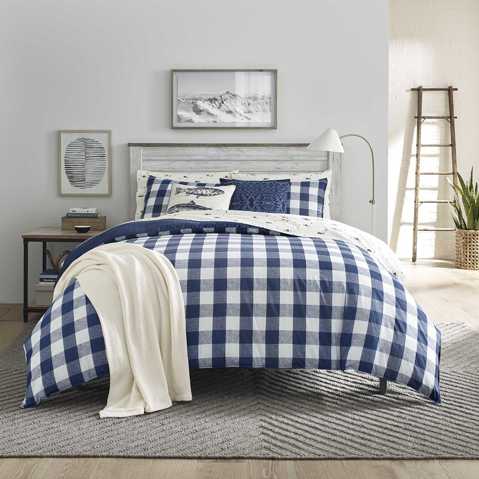 Bring a fresh look to your bedroom décor with the Lake House Plaid cotton duvet cover set from Eddie Bauer. Featuring an updated take on a classic plaid pattern, the set features an indigo and white plaid face and a solid indigo reverse, which brings rugged charm to your sleeping oasis. Elevate the set further by layering in one of our cotton flannel sheet sets or cotton blankets for a more complete bedroom look. Duvet cover features button closure and additional inner corner ties to secure the duvet insert in place during use. Duvet insert is not included and the set is machine washable for easy and convenient care.