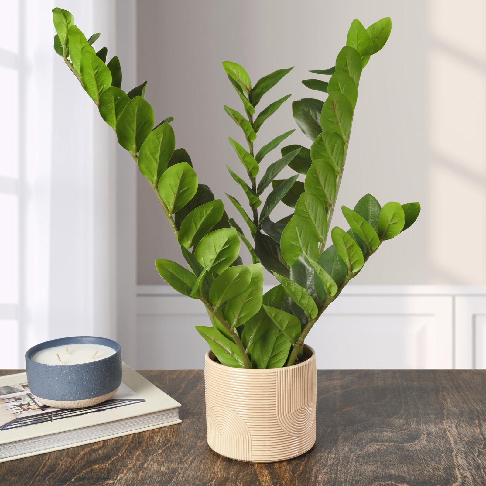 This Elements Artificial ZZ Plant is made of soft-touch plastic for a lifelike look and feel. Displayed in a modern pot, it adds a touch of style to your home. Artificial greenery is the perfect, low-maintenance solution to bringing the beauty of nature into your home -- no sunlight or watering required. Faux plants create a relaxing, welcoming atmosphere and brighten any office, bedroom, bathroom, kitchen, balcony, living room, apartment, cafe, or classroom. Plus, they make a great gift. Plant may ship compressed; adjust when removed from box to match the image shown.