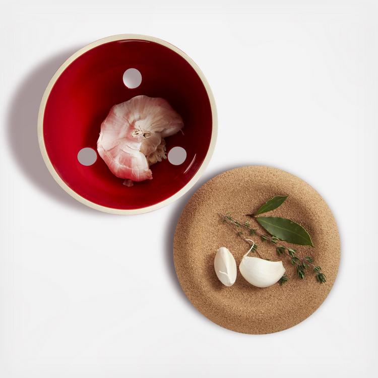 Since 1850, Emile Henry has produced in France a large range of high quality ceramic cooking utensils. Their products are made from natural materials and have been designed and manufactured in France, in Southern Burgundy. Whole heads of garlic will keep for several weeks or longer when stored at room temperature in a dry, dark place (to prevent from sprouting) that is well vented. Since garlic's lifetime decreases once you start removing cloves from the bulb, the top of the lid is the ideal place to keep in sight remaining loose cloves. 3 small openings in the bottom ensure the contents are well vented. Stackable for space saving storage.