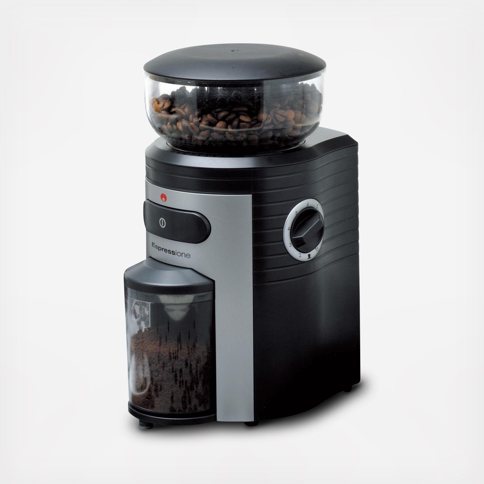 Espressione’s commercial quality grinder stands out from the rest with its powerful grinding conical mechanism and precision controlled engineering. Large 8½ ounce hopper and 15 levels of grinding all provide convenience and versatility. Whether brewing coffee or making an espresso the grinder can complete the job fast. The finest setting is ideal for preparing Turkish coffee, which is a rare feature to find in a grinder. A built-in timer with quantity measure can make from 2 to 10 cups in a matter of seconds and will stop automatically when ready. The coffee container holds up to 4 ounces of grounds and remains sealed during grinding and is anti-static. Superior functions and smart design make Espressione Professional Conical Burr Coffee Grinder the ideal commercial quality grinder for your home and office.