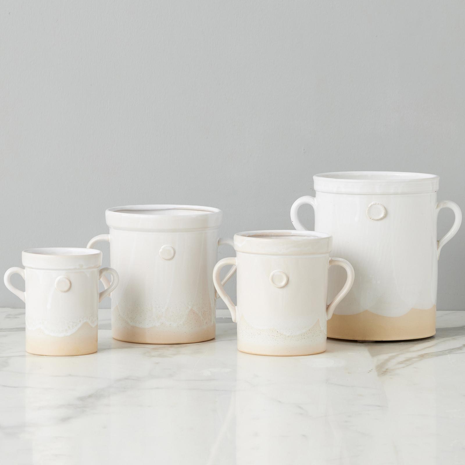 Handcrafted from white European clay, the Handthrown Pottery Collection is created by European artisans on an original potter€™s wheel. The pieces are inspired from classic European kitchens, mixing traditional designs with contemporary style. While each item is different and will vary due to the handcrafted technique used to create them, each piece boasts a unique lush glaze to enhance authenticity. The raw clay is left untouched on the bottom, while the top portion is dipped in a warm, white lead-free, non-toxic glaze for the perfect mix of traditional design and contemporary style.The utensil crocks were inspired by an Italian staple, the olive jar. The ceramic pots come in three sizes, small, medium and large, each exerting the same effortless beauty as the next. With a clay seal on each side and sturdy handles, the jar is the ideal utensil holder next to your stove or as a flower vase on your counter.