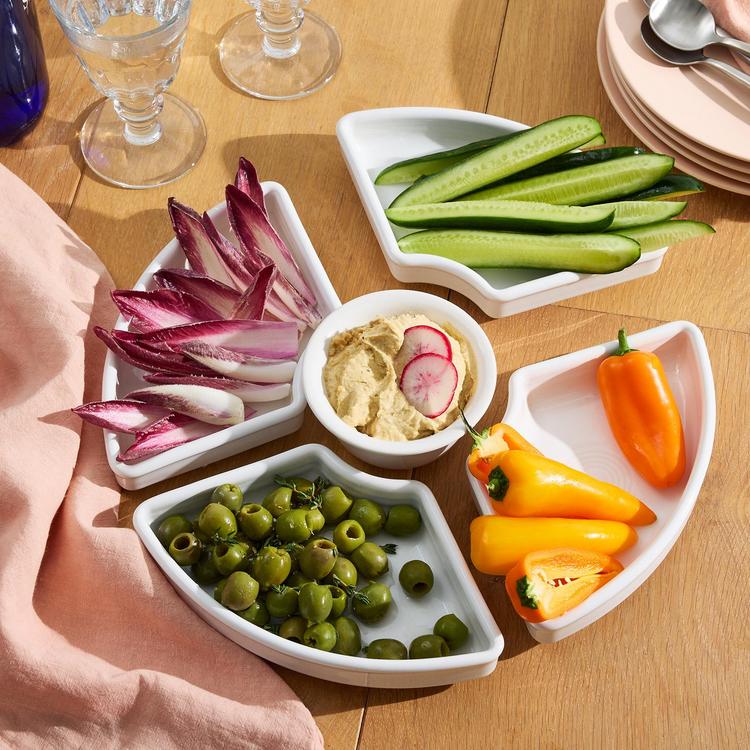 Made for casual and colorful entertaining, this 5 piece Entertaining Set comes with 4 omni trays and 1 bouillon bowl. Serve chips & dip, veggies & hummus, a charcuterie tray, and more in this versatile set.