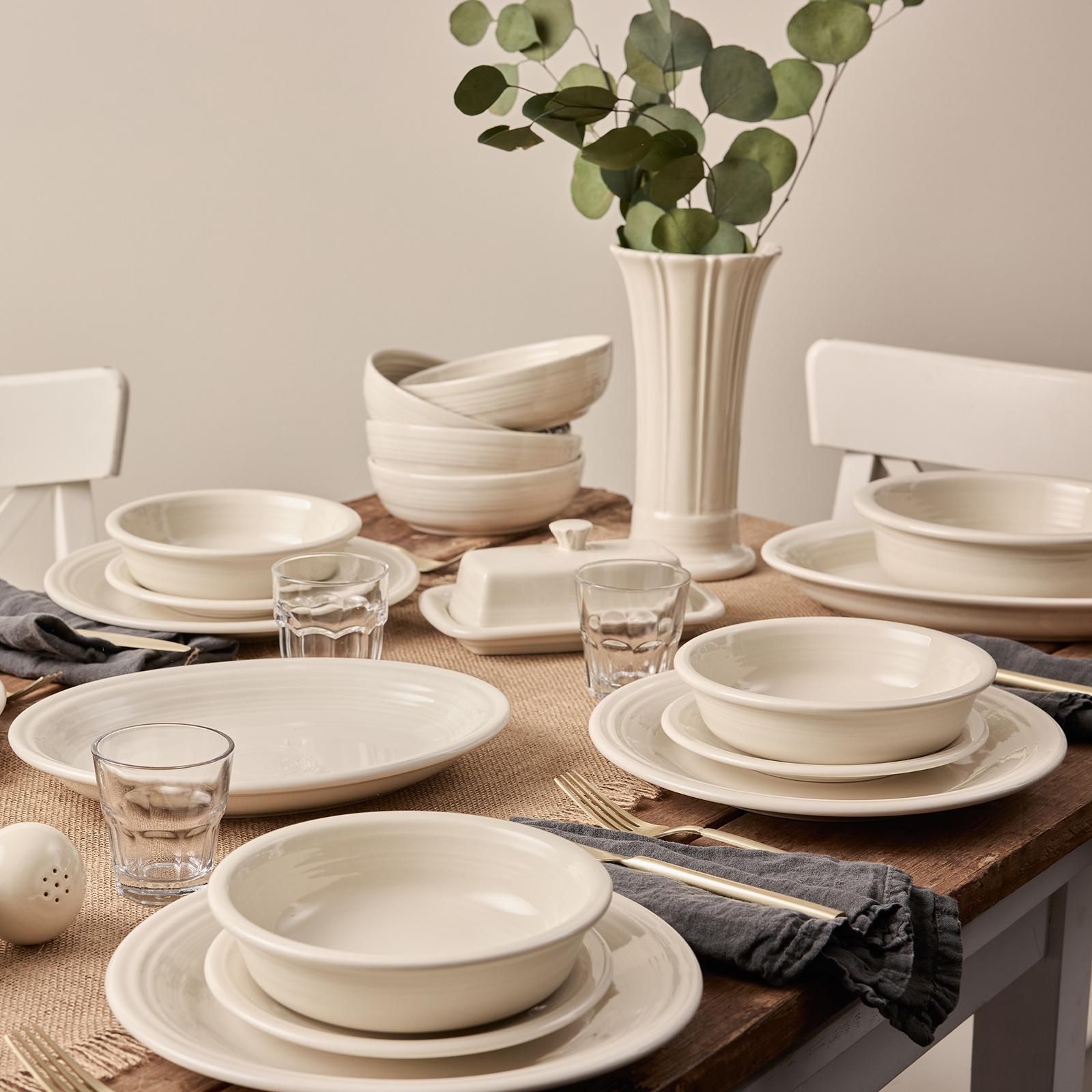 The Fiesta Classic Rim 12-Piece Starter Dinnerware Set offers a complete service for 4, bringing timeless style and versatile functionality to your table. This set making it ideal for everyday meals, family gatherings, or special occasions. Perfectly sized for everything from main courses and salads to snacks, desserts, and cereals, each piece blends vintage charm with modern appeal. The signature concentric Art Deco circles of the dinner plate add a retro touch, while the smaller plates and bowls are perfect for serving, snacking, and entertaining. Available in Fiesta’s iconic, vibrant colors, this set is easy to mix and match for every season or occasion, allowing you to create a colorful and stylish table setting for any meal.