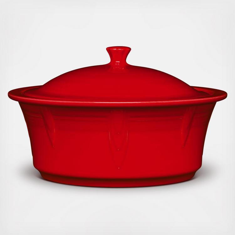 The Fiesta Large Round Covered Casserole is a versatile kitchen essential, ideal for casseroles, side dishes, reheating leftovers, and more. The tight-fitting lid circulates steam, keeping food moist and flavorful. Crafted from signature premium ceramic, it ensures even heat distribution for golden-brown crusts and crispy edges. Its straight sides make serving easy. Fully oven, microwave, dishwasher, and freezer safe, it handles temperatures up to 500 F for versatile cooking. Finished with a vibrant, scratch-resistant glaze, this casserole seamlessly transitions from freezer to oven, oven to table, and table to dishwasher.