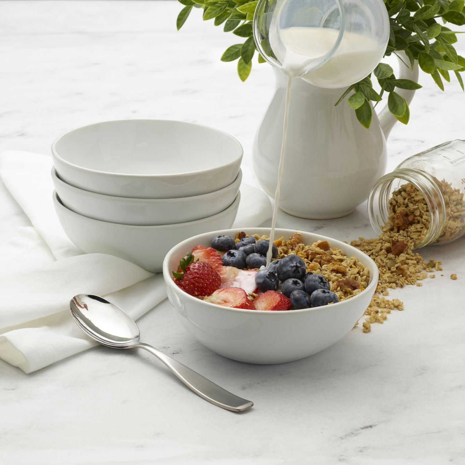 This contemporary and sophisticated Set of 4 Everyday White Organic Shape Soup/Cereal Bowls by Fitz and Floyd is perfect for everyday use as well as more formal occasions. Each piece boasts a handmade, artisanal look for a fresh, stylish tablescape. Beautifully crafted of porcelain in basic white and will match any home decor.
