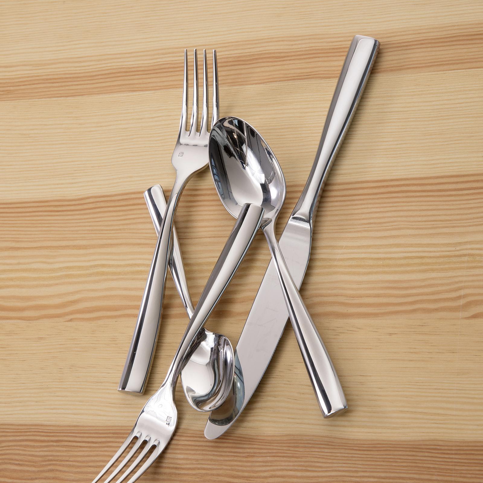 This flatware embodies a passion for design combined with a commitment to the finest materials. Made from heavy-gauge 18/10 stainless steel (the heaviest gauge used for tableware), each implement provides a comfortable heft and balance in your hand. Graceful, contemporary curves are enhanced by an eye-catching textural detail.