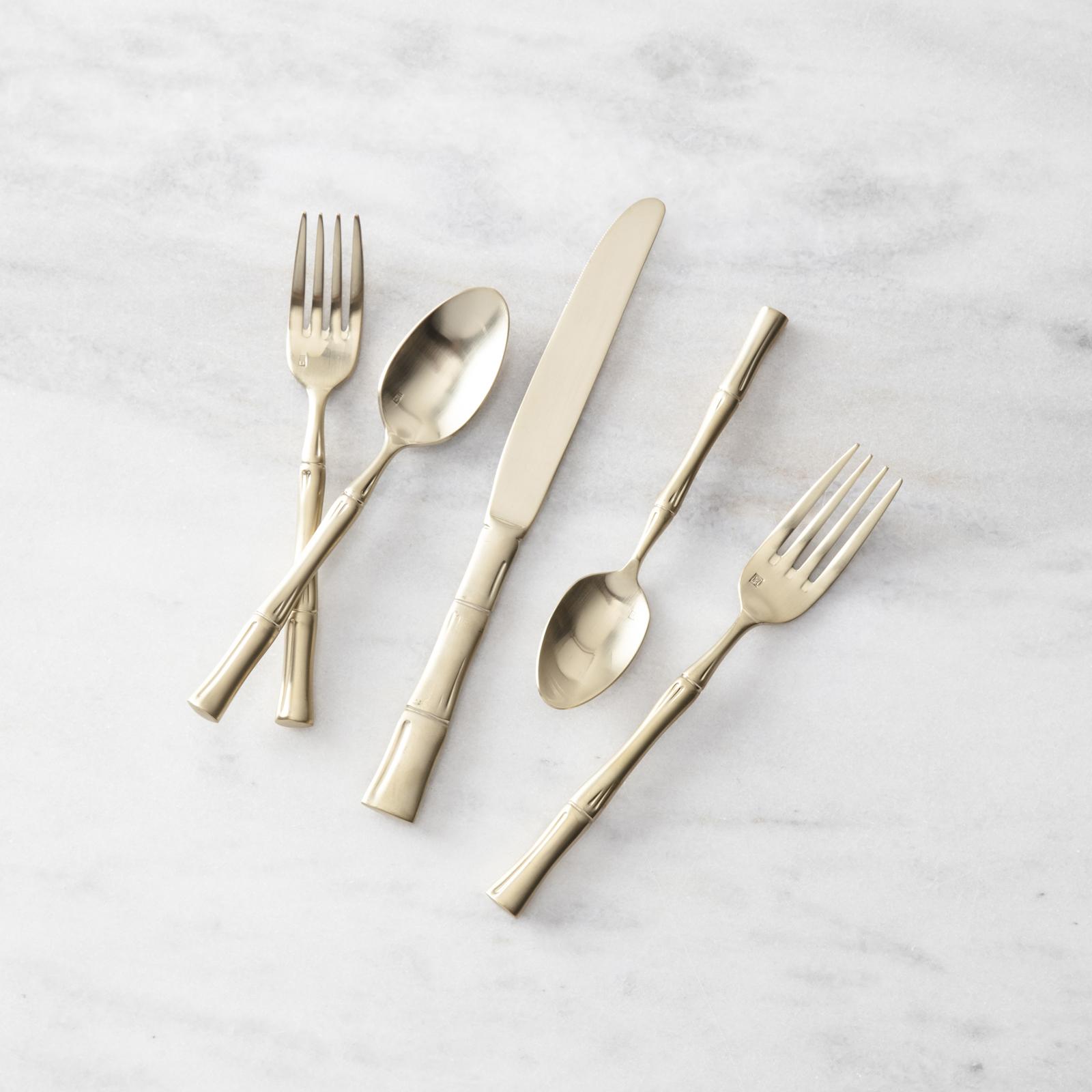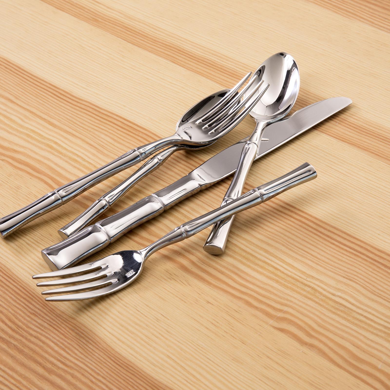Flatware embodies a passion for design combined with a commitment to the finest materials. Made from heavy-gauge 18/10 stainless steel (the heaviest gauge used for tableware), each implement provides a comfortable heft and balance in your hand. An elegant accent that implies south seas adventor and tropical decor, a contemporary accent to any dinner party.