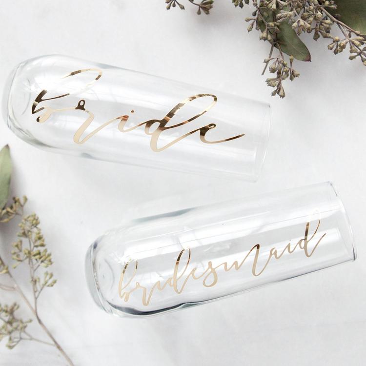 Pop the bubbly, these stemless champagne flutes are perfect bridesmaid gifts! They're great for bridesmaid proposals or even for the bachelorette party or wedding day. Titles are printed using precision-cut mirrored gold vinyl in a beautiful script font. Cheers!