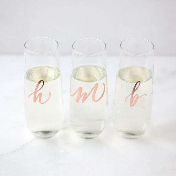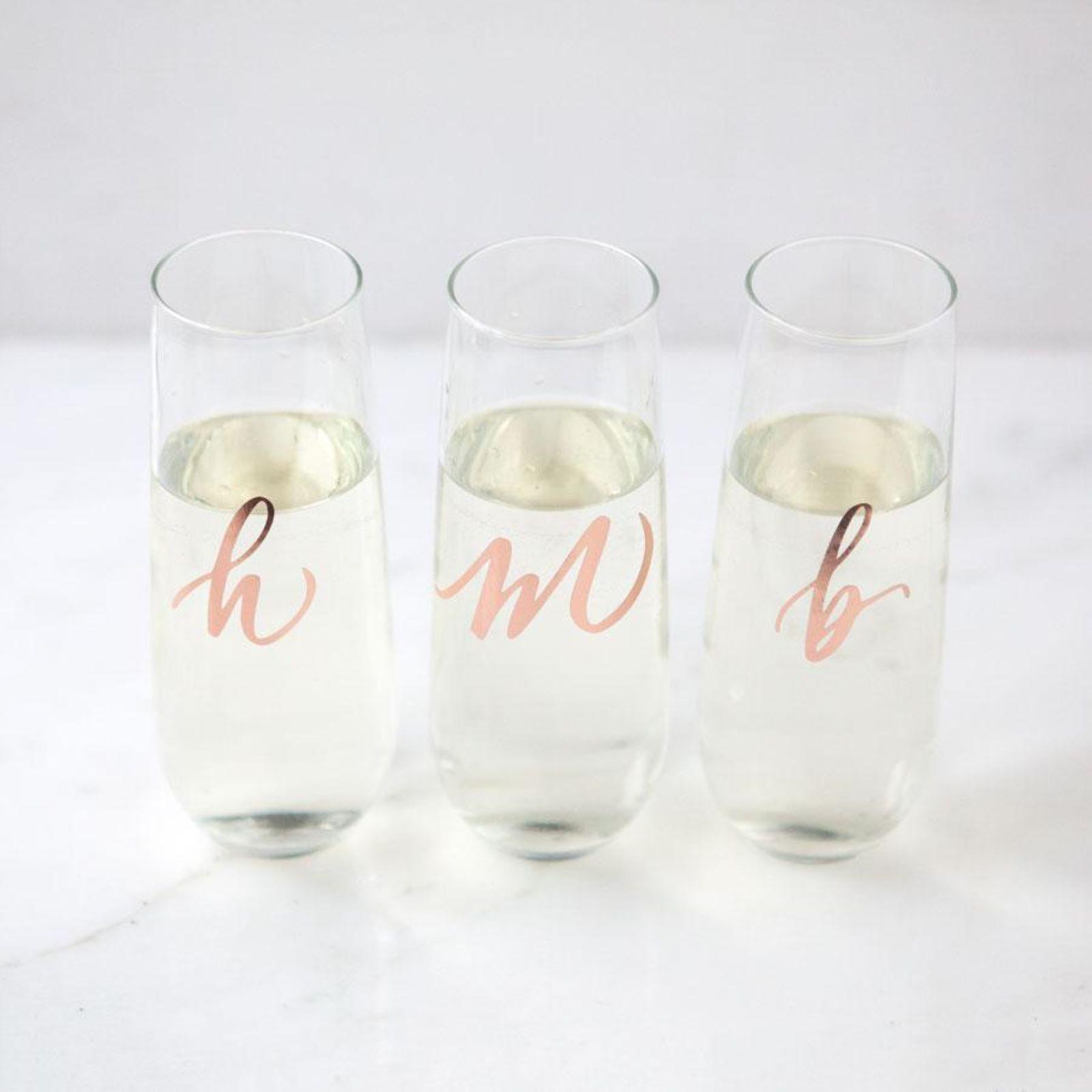 Pop the bubbly, these Monogrammed Stemless Champagne Flutes are perfect bridesmaid gifts! They're great for bridesmaid proposals or even for the bachelorette party or wedding day. They're gifts your girls will use long after the wedding. Initials are printed in a cursive font using precision-cut mirrored rose gold vinyl. Cheers!