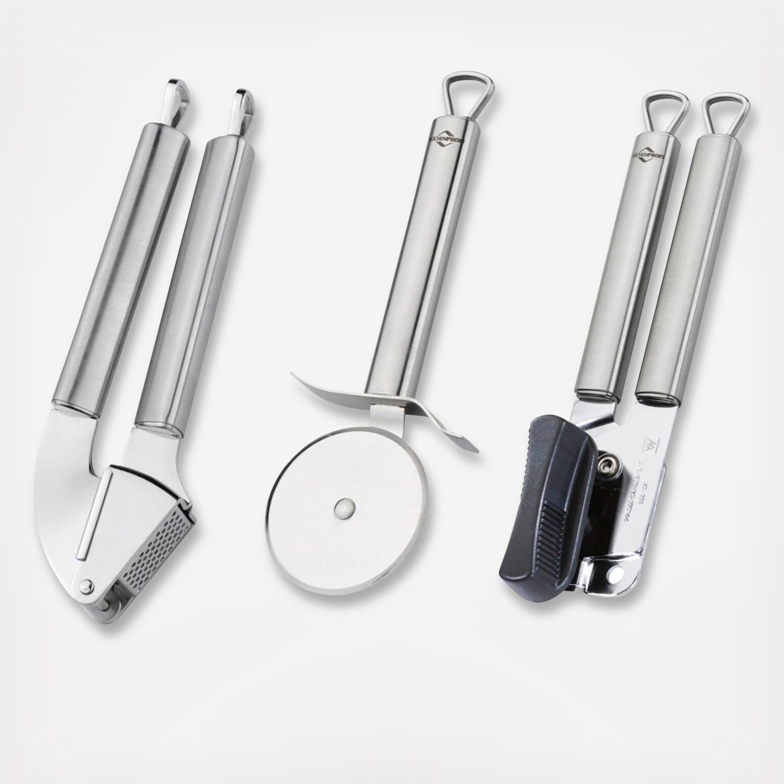 Dimensions: garlic press: 10.8 x 2.4 x 1.1 in.; can opener: 8.5 x 2.9 x 0.6 in.; pizza cutter: 8 x 1.9 x 2.1 in.