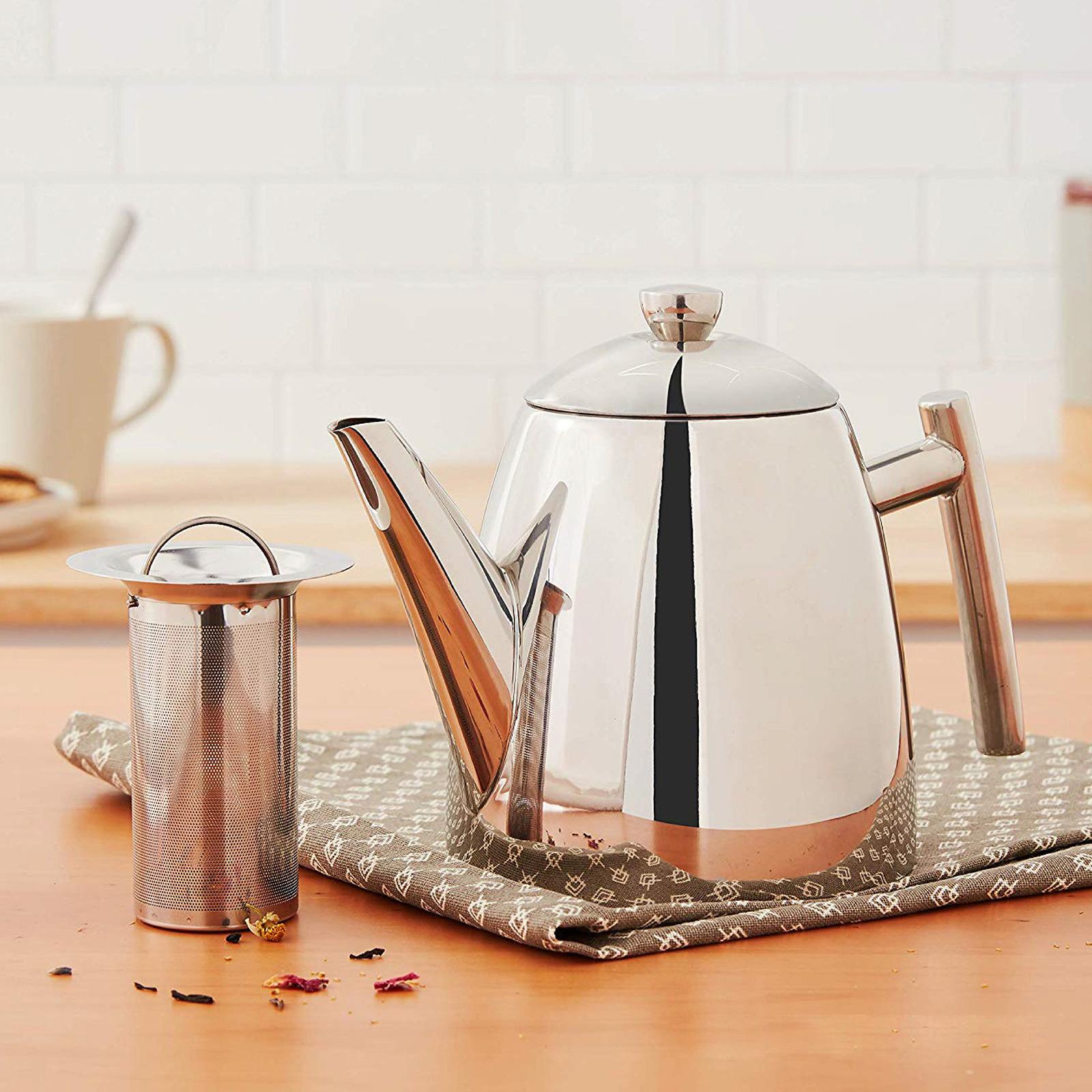 Captivating design comes complete with a spacious micro-etched infuser. It allows the tea leaves to expand and develop their fullest flavor while holding back even the smallest tea particles. A fold-down handle provides for easy insertion and removal of the infuser. A built-in tea leaf guard further ensures that no leaf makes it into the cup.