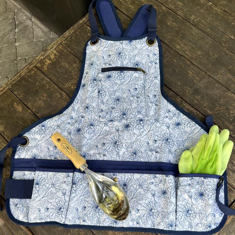 Floral garden apron - new floral pattern, easy care heavy duty cotton canvas , metal grommets, reinforced pockets, double reinforced pruner pocket, 12 lower pockets, 2 pencil/marker pockets, loop for hammer trowels or whatever else you may need. Criss crossed back straps with padded shoulders.