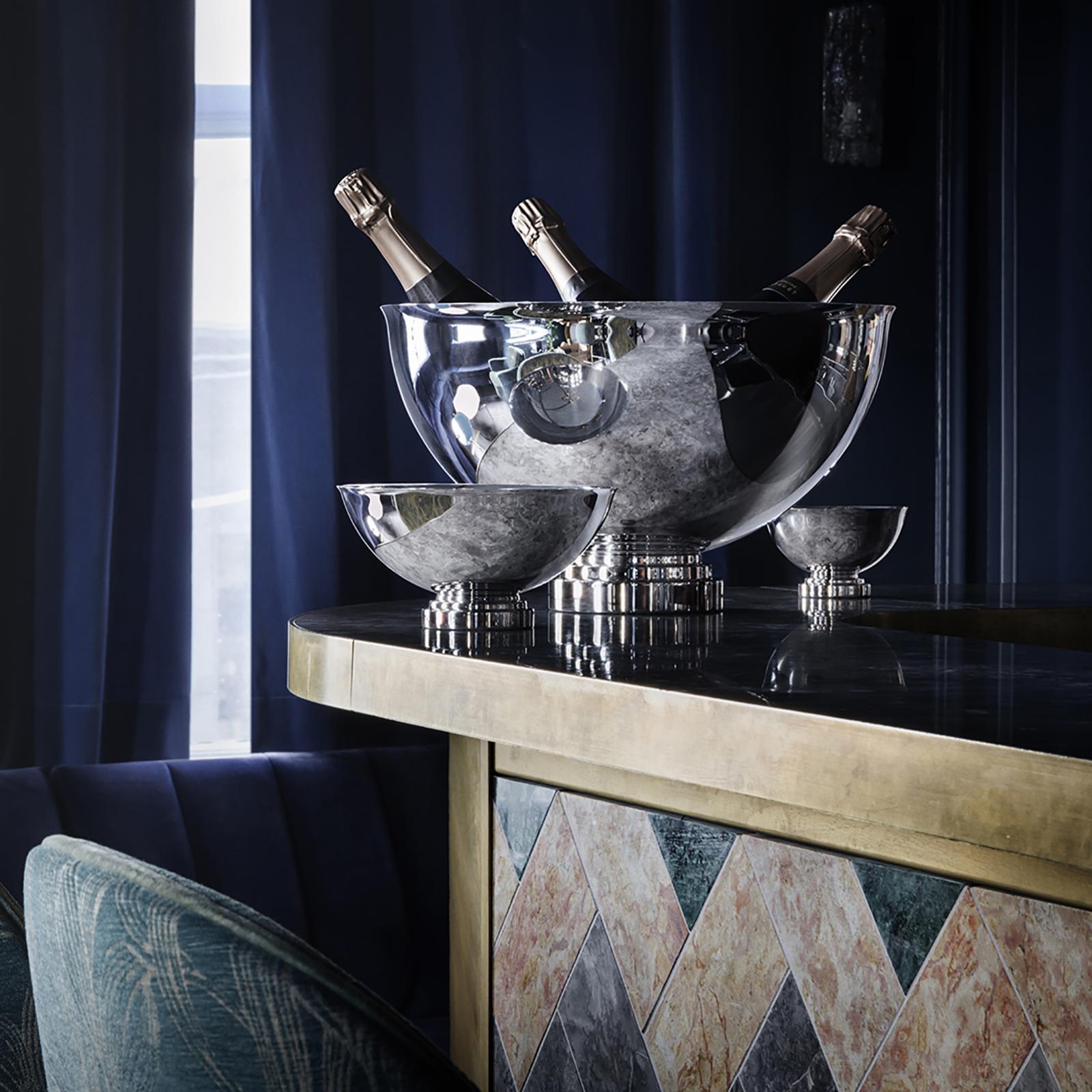 Generously sized to chill several bottles of bubbly, the Stainless Steel Manhattan Champagne Bowl takes its influence from the Art Deco movement as well as the Georg Jensen archives. The classic design, from a collection inspired by New York City's glamorous Gatsby era, easily graces transitional and contemporary settings.