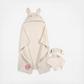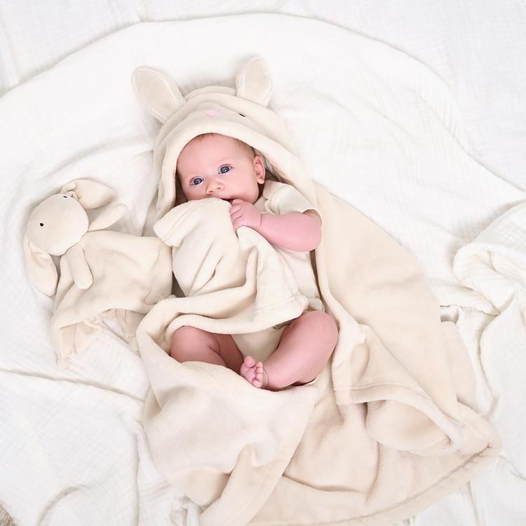 The bunny blanket set is the perfect duo for baby's cozy moments. Crafted from exceptionally soft material, both blankets in this set promise gentle warmth and comfort. The security blanket will quickly become their best friend, with the comforting bunny providing a sense of security and reassurance wherever they go. At home, the hooded blanket will not only keep them warm, but also adds a touch of whimsy with its adorable bunny face. This set is an ideal choice for taking a piece home out while on errands. An ideal baby shower gift, this set will be loved by moms and babies alike. Our essentials have been independently certified with STANDARD 100 by OEKO-TEX so that theres no worry about harmful substances. This pack includes one hooded blanket and one security blanket.