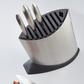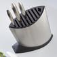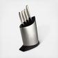 SAI 5-Piece Knife Block Set has each blade is individually hammered by hand and designed so that small hollows create air pockets between the blade so food elegantly falls away from the surface. Perfectly balanced and ergonomic handles designed in the traditional Japanese bushido way of the Samurai. Unique convex edge of the blade makes cuts smoother, requiring less energy.