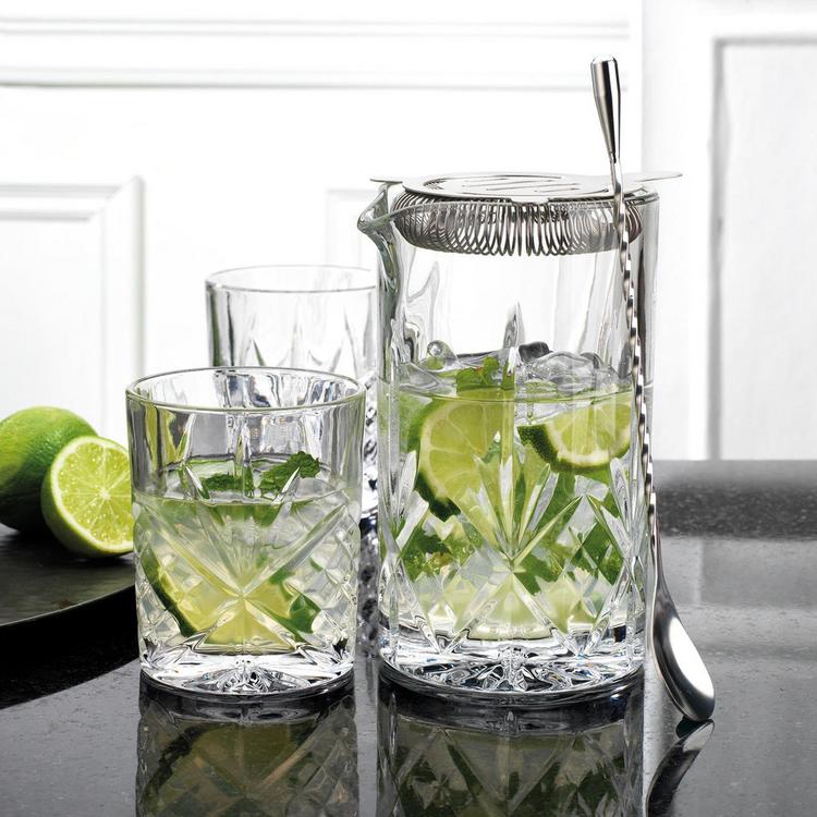 The Dublin collection honors the legacy of crystal-cut glass, combining grace and sophistication with a brilliant-cut pattern. These timeless pieces will surely be a distinguished addition to any home, and the mixing set is a bartender's favorite.