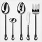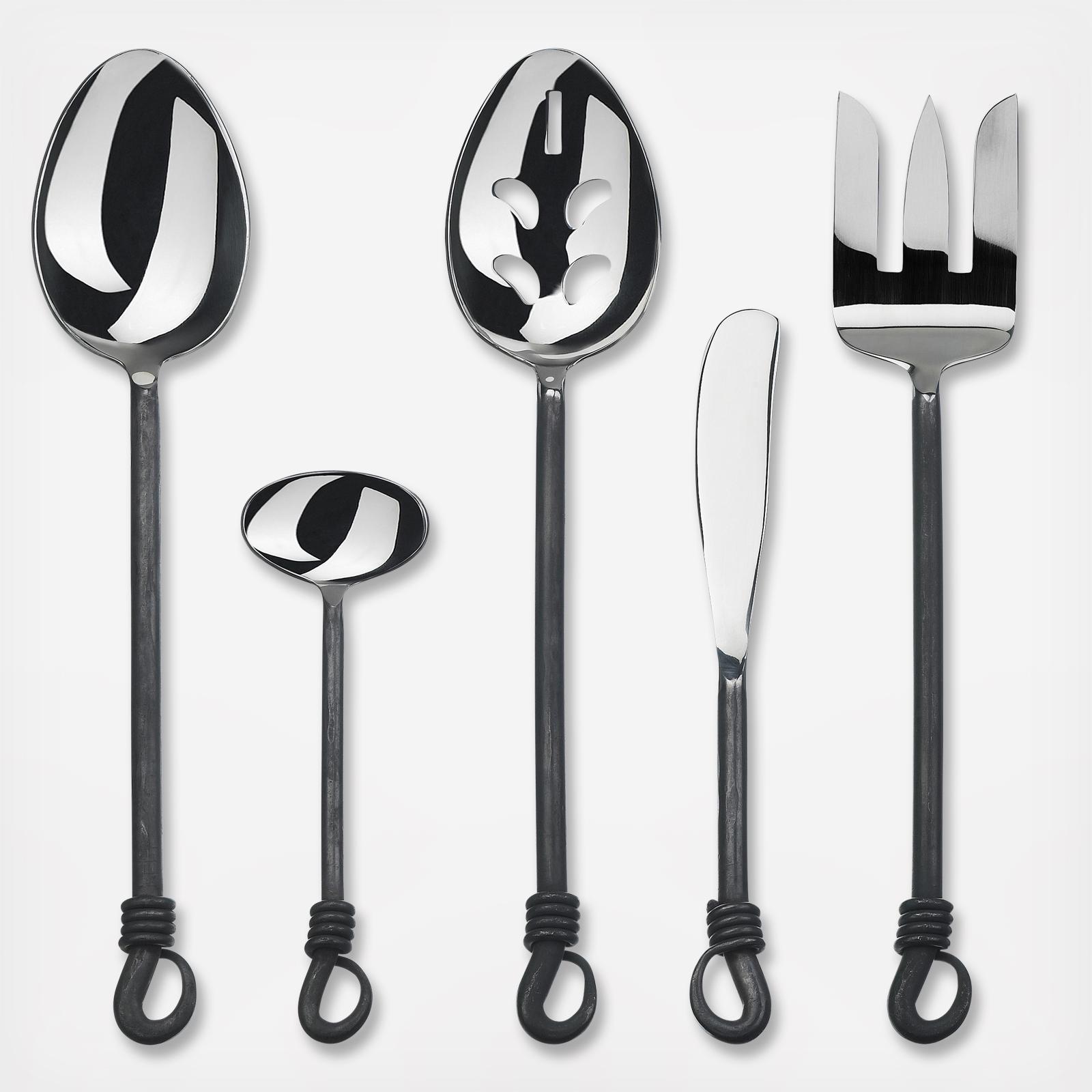 Twist N Shout 5pc Hostess set is a perfect extension of the 20pc flatware set. Twist N Shout offers a dark and mysterious, rustic charm with a blackened body and polished top. Set includes a serving fork, serving spoon, slotted spoon, sugar spoon and spreader. 20pc Flatware set also available, sold separately.