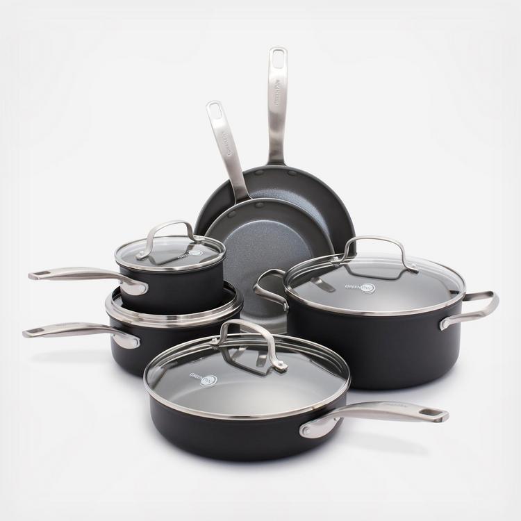 Whether you’re a casual home cook or professional chef, you probably know that great kitchen basics are the key to making incredible meals. Constructed with durable, hard-anodized bodies for maximum strength and scratch protection, Chatham’s interior is complete with Thermolon healthy ceramic non-stick, now upgraded to be metal utensil safe. Thermolon achieves cooking perfection with less oil and is easy to clean, but for your convenience is dishwasher safe. Manufactured without PFAS and PFOA. Drip-free edges allow for easy pouring with less mess and durable, contoured, oven safe stainless steel handles give you a secure grip. Select pieces are covered with glass lids for easy food monitoring without losing heat, helping you keep an eye on your meals. GreenPan Chatham creates your perfect kitchen.